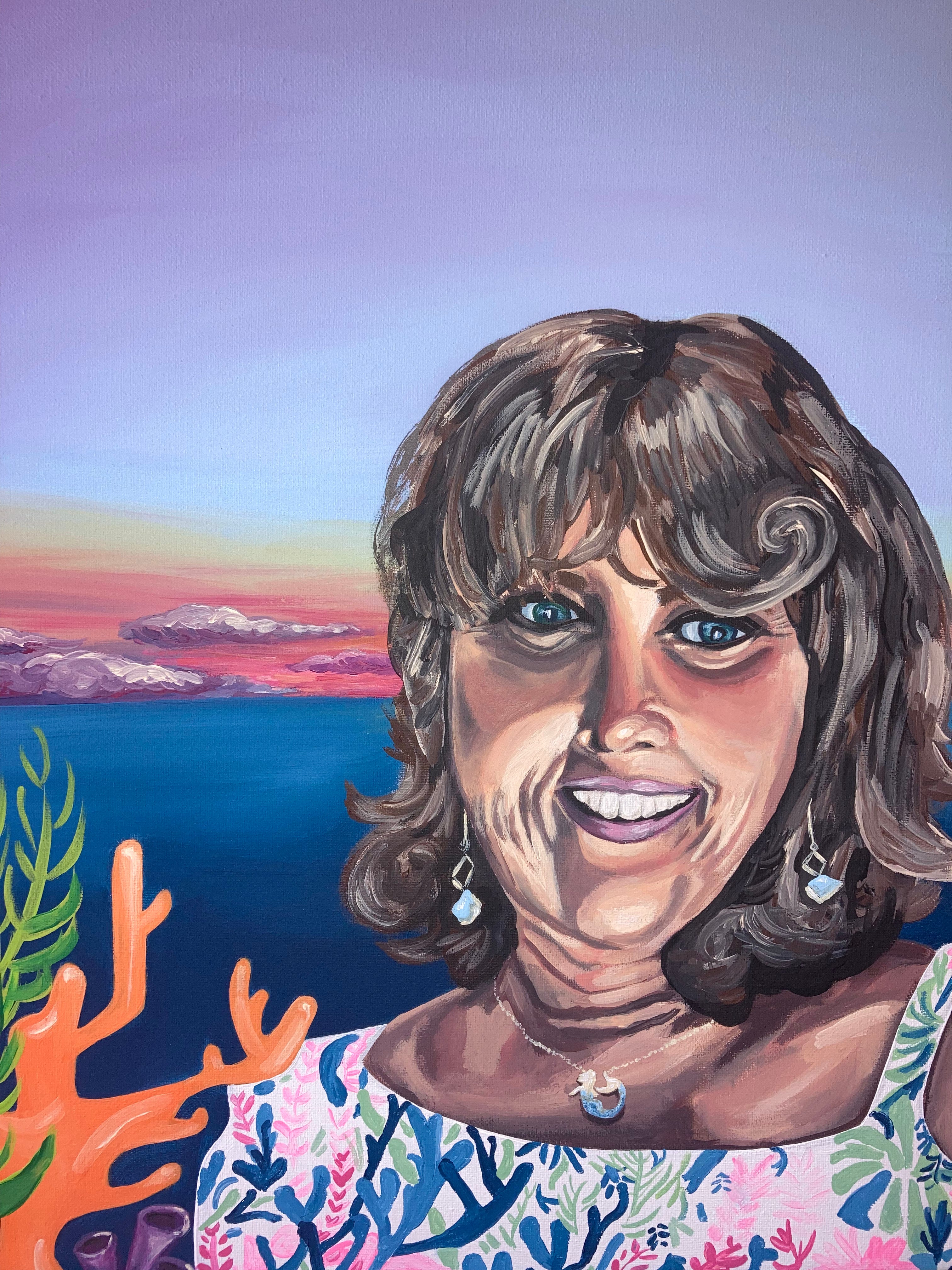 For the purposes of acknowledging a beginning of this series (although there were earlier iterations and smaller starts that allowed this theme to percolate for years preceding this moment, which I will expound upon later on), the first so-called “grief painting” I completed was for a law school classmate who lost her mom to cancer during our 2L year. I had met her mom just once in-person, but that singular time coupled with the stories my classmate shared with me about her mom were enough etch her personality and memory into my mind, unknowingly preserving it for the exact moment my classmate asked me to paint her mother’s portrait prior to our law school graduation.