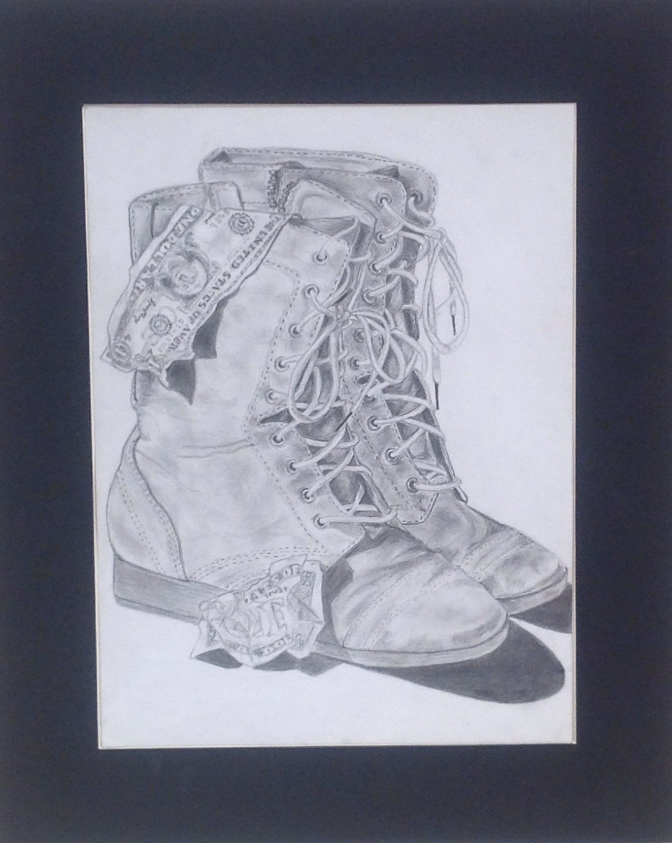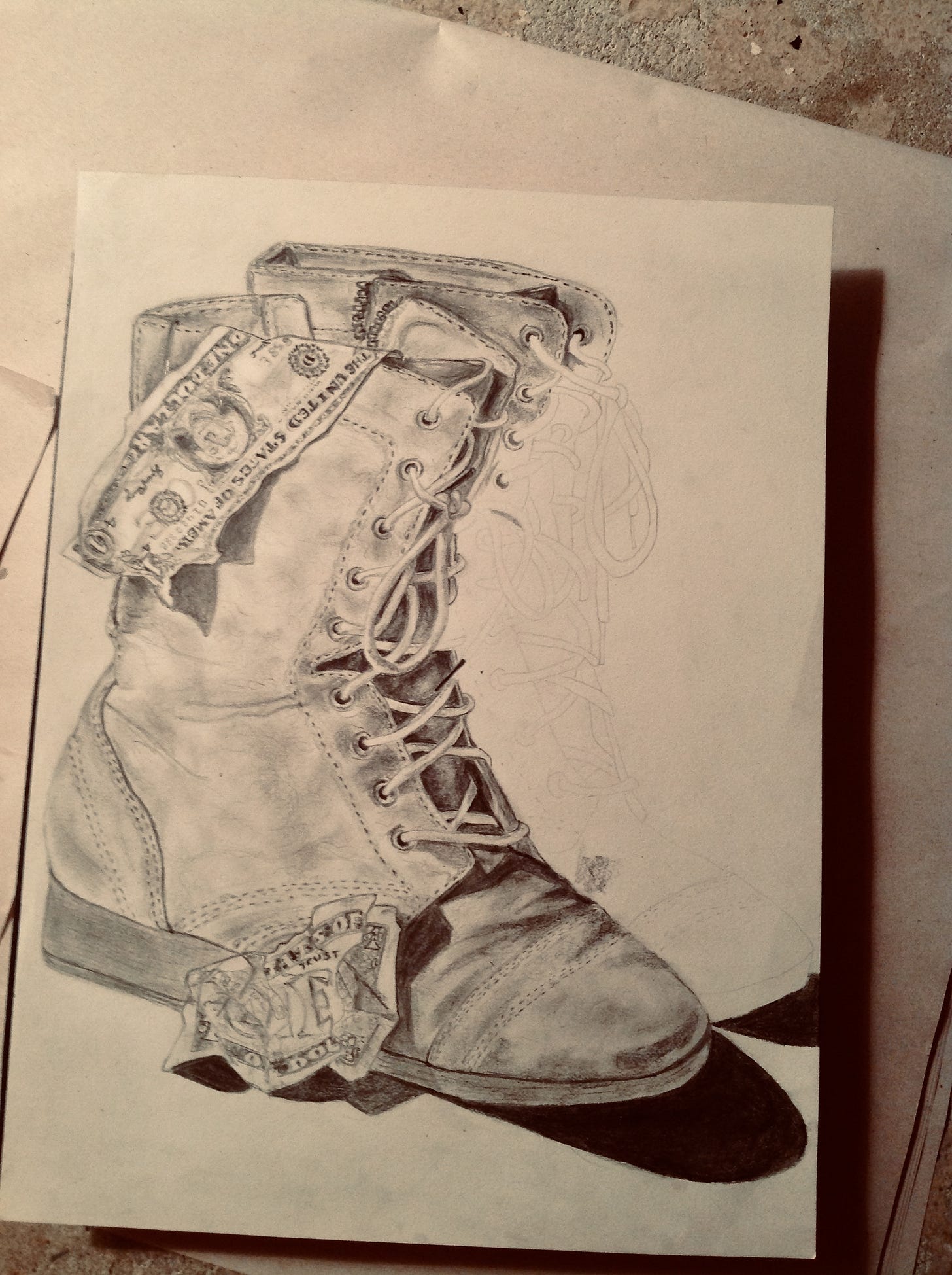 Prior to this painting, in response to the loss and deep emotion immediately following Pap’s death, I created a still life drawing of a pair of combat boots I had worn back then with crumpled up dollar bills. The drawing was a depiction of one of the phrases I heard my Pap say to emphasize his certainty, “Bet your boots.” I titled the drawing with that same phrase. I find it fascinating that even in my own grief at a far younger age than I am now, in response to loss, my reaction was to create. Turning pain into preservation, memory into creativity, death into art, seems to be a theme in much of my life and life’s work. Processing grief through still life is ironic only in name and practical in every other sense such that in those depicted objects the dead are still very much alive. It is as if in these objects there is ‘still life’ for the things we’ve lost. The fact that these objects are still here in the physical sense makes it seem like those that are dead are not gone entirely, like our loved ones are also still here in the physical sense, even if it is in pieces—and that somehow their life still exists, telling us that there is still life worth living.