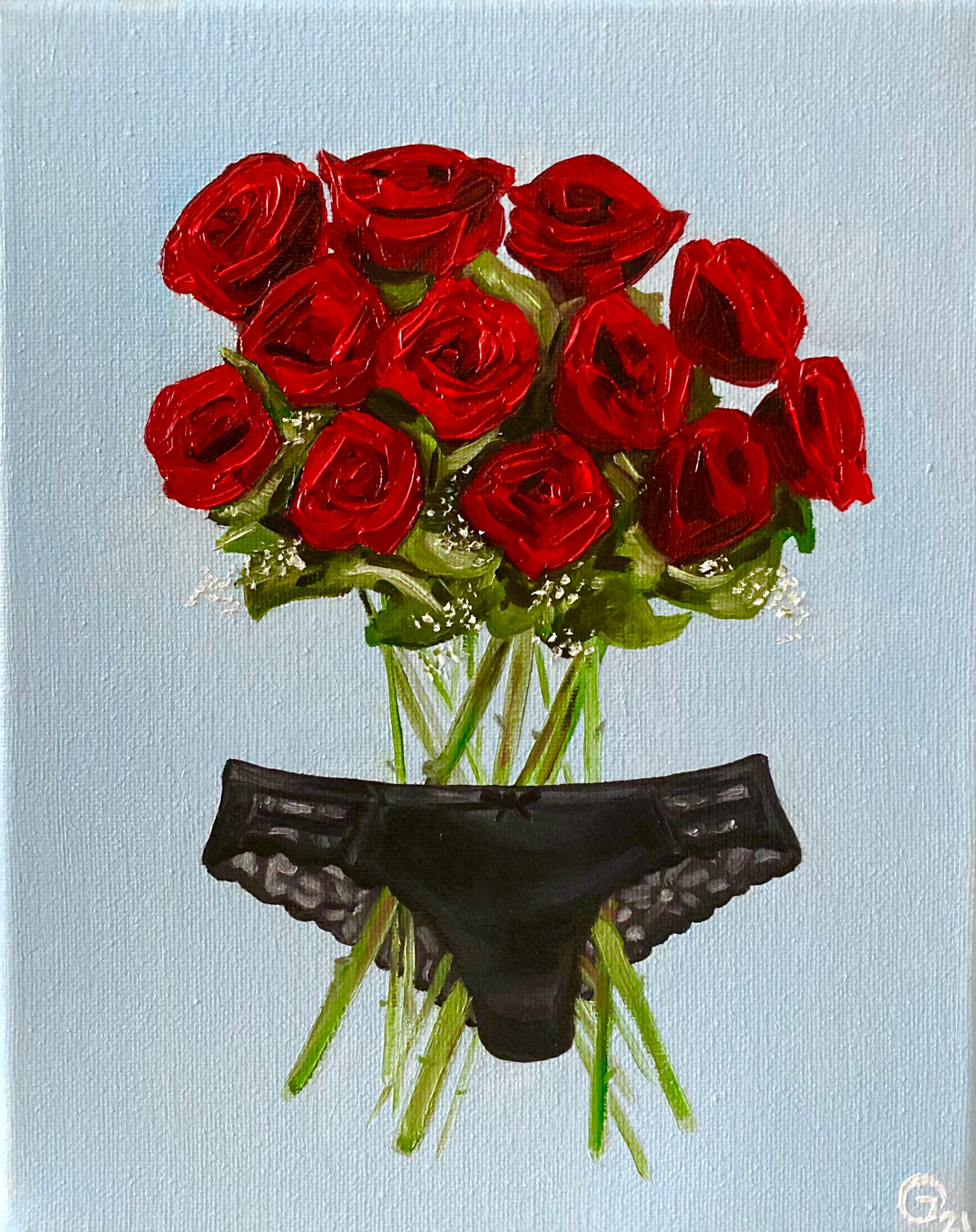 In between these two seminal works, I created a third grief painting honoring the life of another deceased mother. A year or more prior to putting my brush to this particular canvas, I was inspired by a story a mentor of mine shared about her mother, who like my classmate’s mother, also died while my mentor was a law student. The story she shared went something like this: Following my mentor’s first court appearance, her mother sent her a dozen roses with a pair of underwear tucked inside the bouquet and a note that read, “Stay wild.” Shortly thereafter, her mother passed away. My heart broke when she shared this story and the way she told it—teary-eyed—I could tell she carried the grief of her mother closely. It makes sense to me now that upon completing my classmate’s portrait of her mother, I transitioned into creating a painting for my mentor, given their undeniable parallel loses. But having no context for what my mentor’s mother looked like the subject matter could not be a portrait in the traditional sense. The next best thing in my mind was a painting that captured this particular memory of her mother sending her the roses and underwear, so that is the painting I created. Somehow this grief painting, without depicting the appearance of a face, still preserved the memory of the individual it was designed to honor through the subject matter as a still life, rather than portraiture.