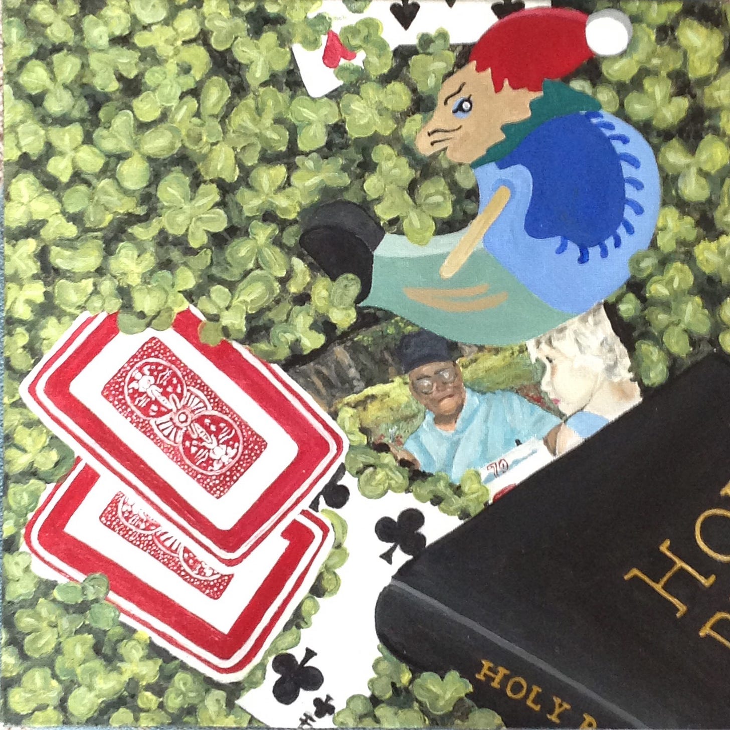 Along the line, I learned I was not alone as an artist depicting grief or loss through still life. Vincent Van Gogh painted “Still Life with Bible” shortly after his father, who was a minister, died. The painting displays an open Bible propped up on a table, against a a dark background with an unlit candle and a closed copy of Émile Zola's La joie de vivre nearby. This still life was Van Gogh’s version of a grief painting—memorializing his father not in portrait, but instead by representing himself, his father, and their relationship in the context of two books on a table. The way we remember people is not always in the way that they look, but by the things they did or the things they leave behind. Oddly, prior to discovering this Van Gogh piece, the first painting I did of my paternal grandfather following his death was also a still life with a Bible. I was seventeen-years-old when my Pap died, and an eighteen-year-old, soon-to-be high school graduate, when I completed this painting for a senior year art class. My Pap was not a minister by trade, but rather a man of deep faith. In addition to a Bible, I arranged a composition incorporating one of the handmade wooden toys my Pap created, playing cards, and an old photograph from his 70th Birthday party when I was just two-years-old, all laying in a bed of clover. In its entirely, each portion is symbolic and meaningful for the moments I spent with my Pap while he was here and how I hoped to remember him now that he wasn’t. For an adolescent, experiencing for the first time the loss of someone close to her, the fact that all I could muster was memory through still life not through portraiture, to me now exhibits this inability to come to terms with my Pap’s death.